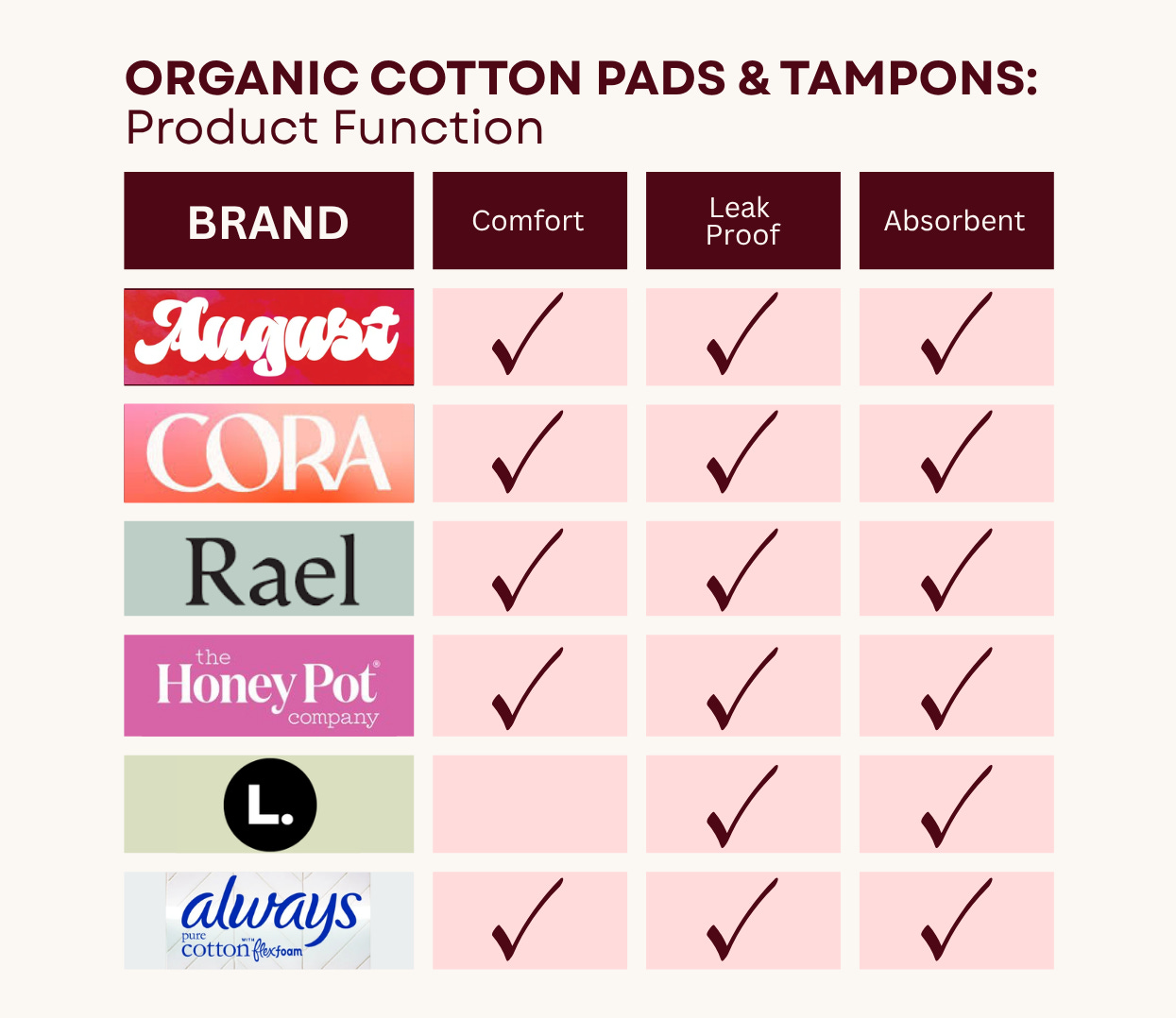 So on a product level, all six brands are at parity with each other. No brand offered a product that functioned better or differently than the other, and all products had very similar ingredient makeups (except The Honeypot Company’s herbal-infused pads—those were the only products that offered remarkable and unique added benefits).