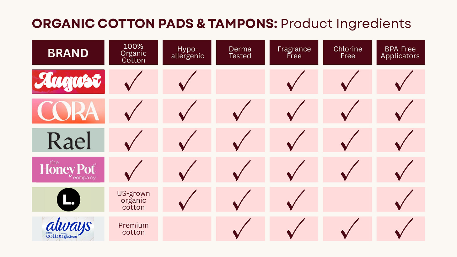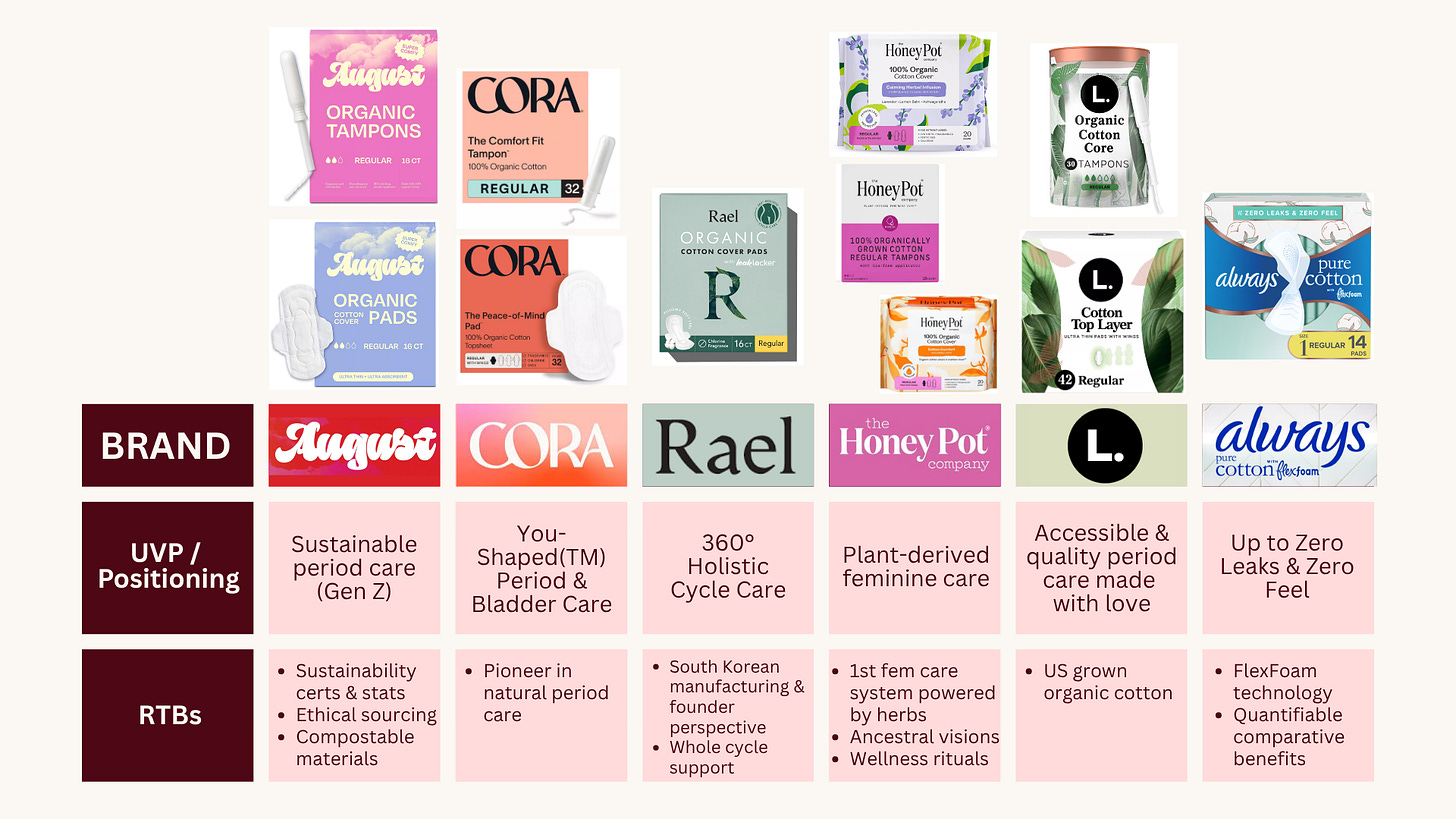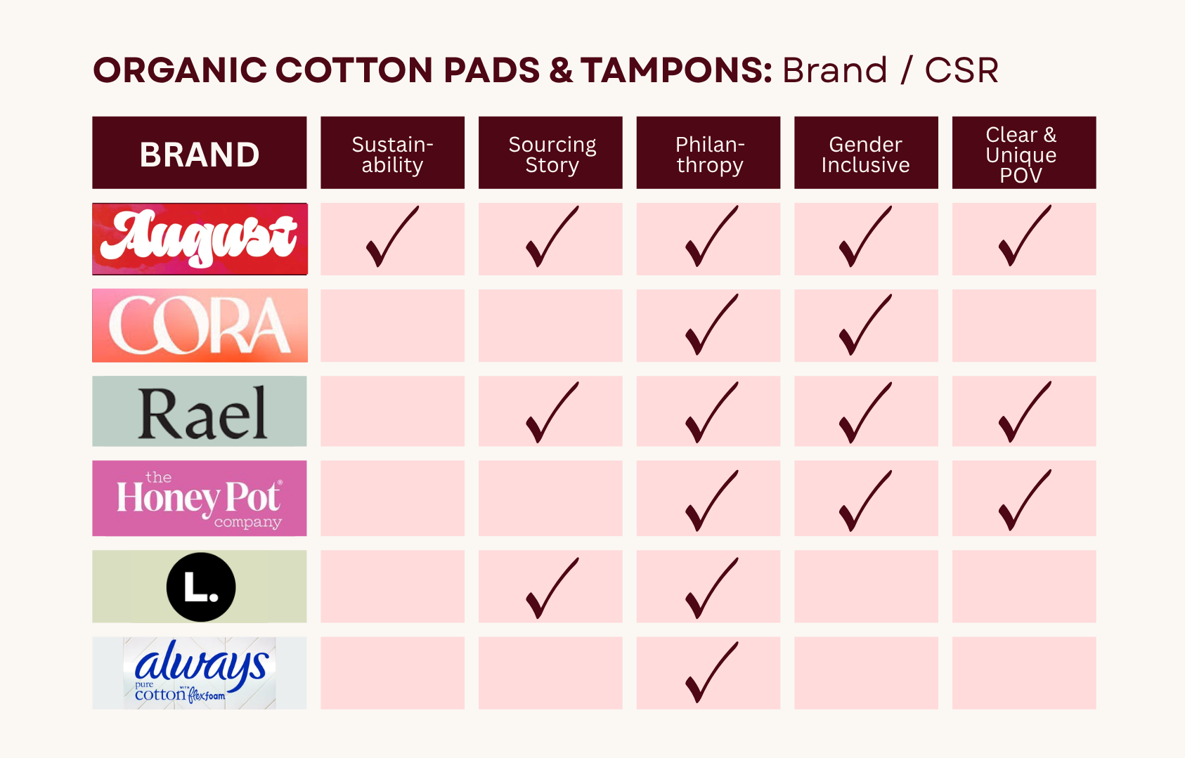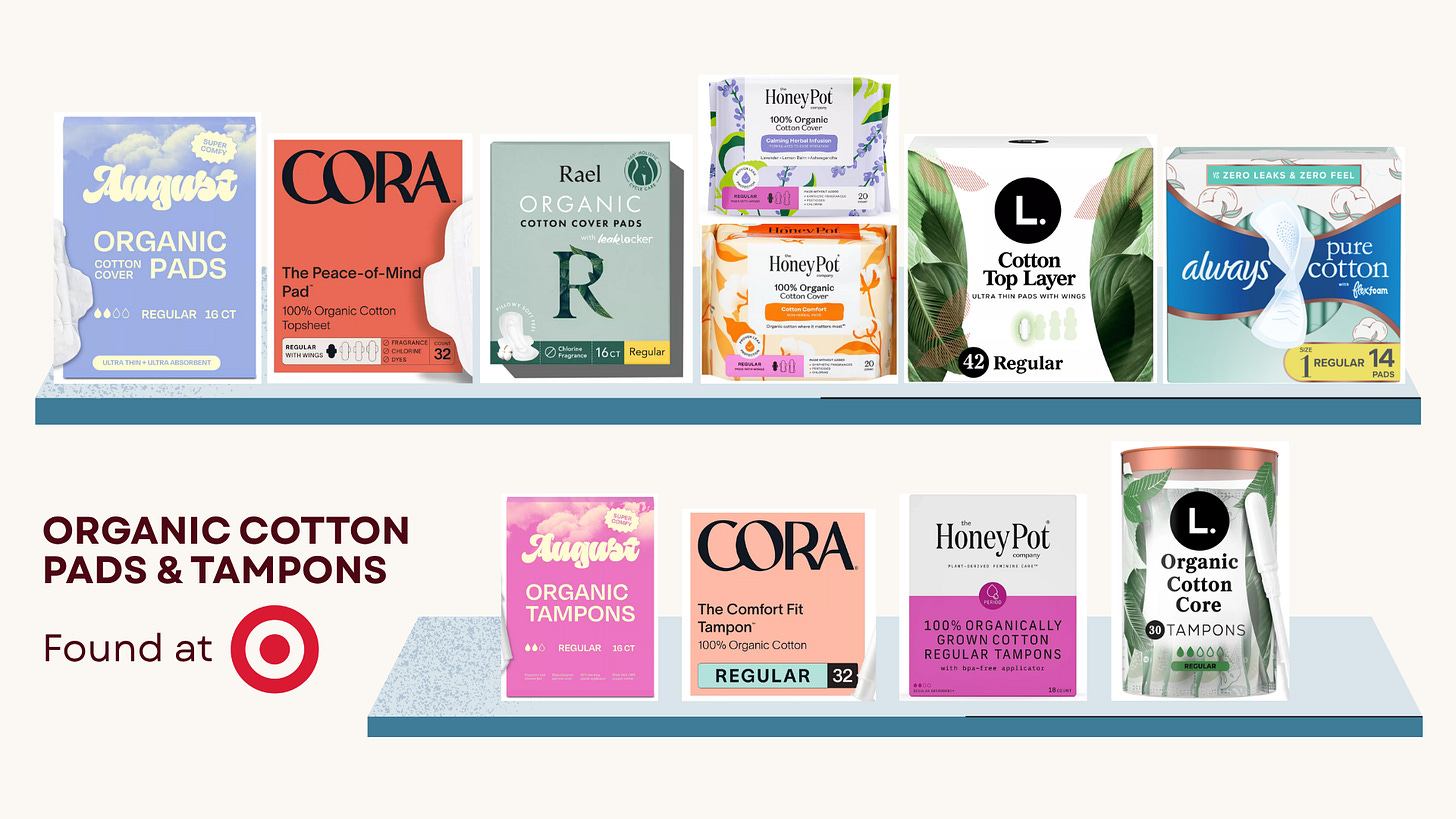 Then I wanted to understand how August stacks up alongside its peers on those shelves. Since Target is one of its biggest retailers right now, I focused on period care brands at Target that use 100% organic cotton to make pads and tampons.